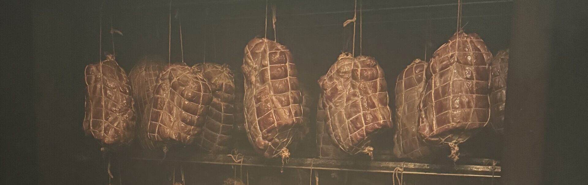 Wędzenie odbywa się w naszej tradycyjnej wędzarni opalanej drewnem. To tutaj wędliny nabierają charakterystycznego aromatu, koloru i głębokiego smaku, który kojarzy się z domowymi wyrobami sprzed lat. Wędzimy spokojnie, bez pośpiechu, pozwalając, by czas i dym zrobiły swoje.