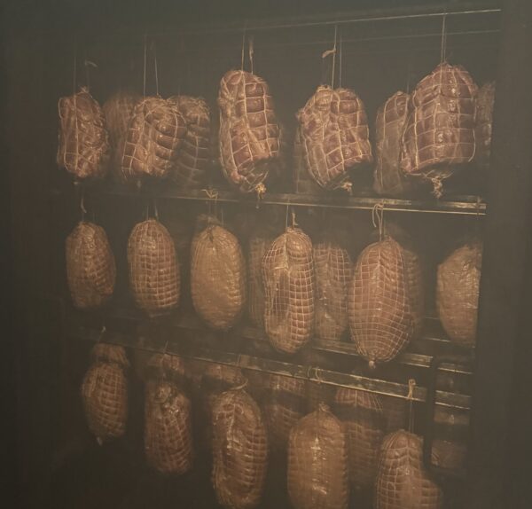 Po wędzeniu wędliny trafiają do parzenia, które wykonujemy w kotłach, pracując w tradycyjny sposób. To etap, podczas którego mięso dochodzi do odpowiedniej miękkości, zachowując soczystość i naturalną strukturę. Dzięki temu aromaty się utrwalają, a wyroby są delikatne i gotowe do spożycia.